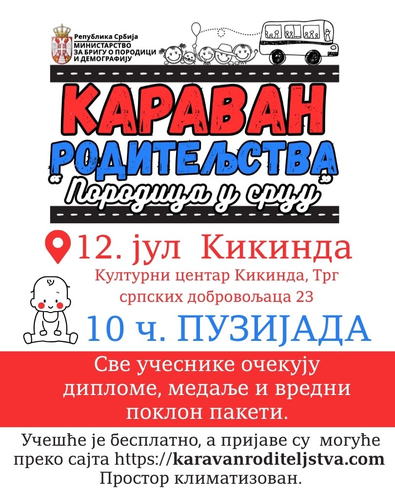 Porodična manifestacija „Karavan roditeljstva“, koju širom Srbije orgaizuje Ministarstvo za brigu o porodici, biće održana u Kikindi u subotu, 12. jula. Sa početkom u 10 časova u Kulturnom centru će biti održana „Puzijada“, u kojoj mogu da učestvuju bebe od 8 do 14 meseci. Nakon toga, sa početkom u 11 časova biće održana interaktivna tribina „Savremeno roditeljstvo, izazovi i rešenja“, namenjena trudnicama i mladim roditeljima, koji od eminentih stručnjaka iz oblasti pedijatrije i patronaže, mogu saznati kako se pravilno pripremiti za bebin dolazak u kuću, o ranom rastu i razvoju bebe, nemlečnoj ishrani, kućnim ljubimcima, i još mnogo toga.
